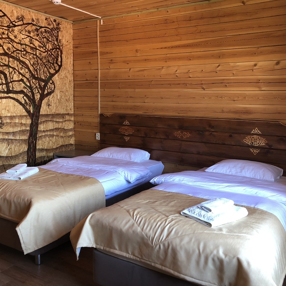 Двухместные благоустроенные номера располагаются в деревянных корпусах и отапливаются в зимнее время, имеют в наличии две односпальные кровати.