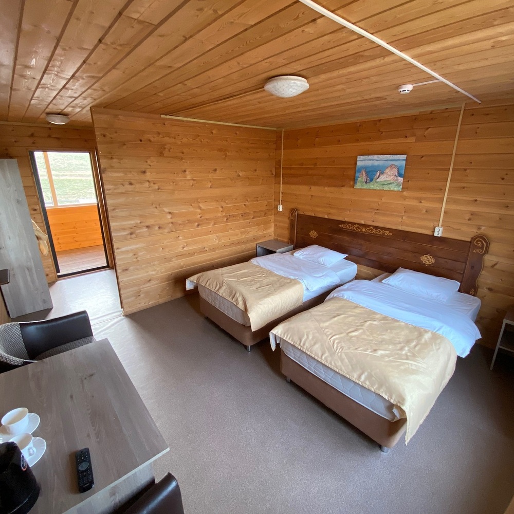Двухместные благоустроенные номера располагаются в деревянных корпусах и отапливаются в зимнее время, имеют в наличии две односпальные кровати.
